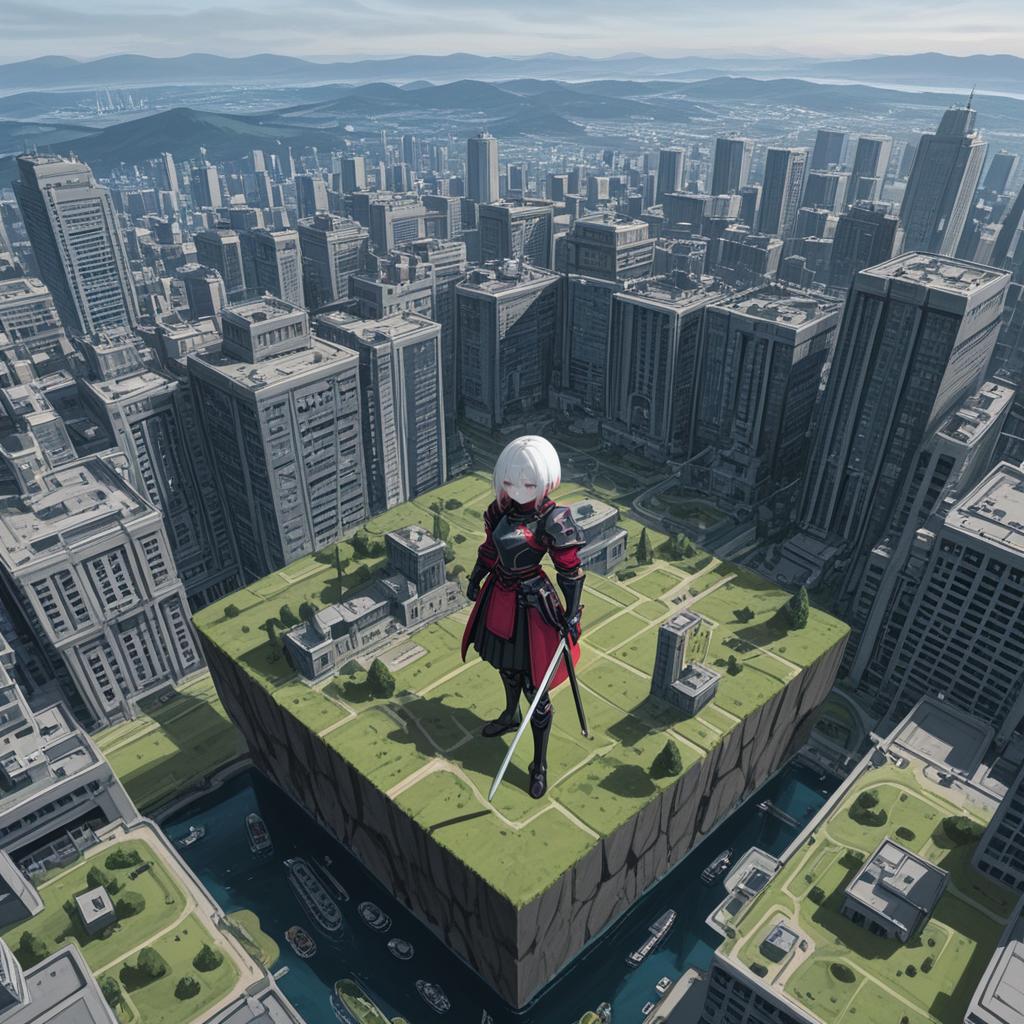 Masterpiece, best quality, 1girl, solo, armor, full body, holding sword, mini\(ttp\), city, miniature, landscape, isometric