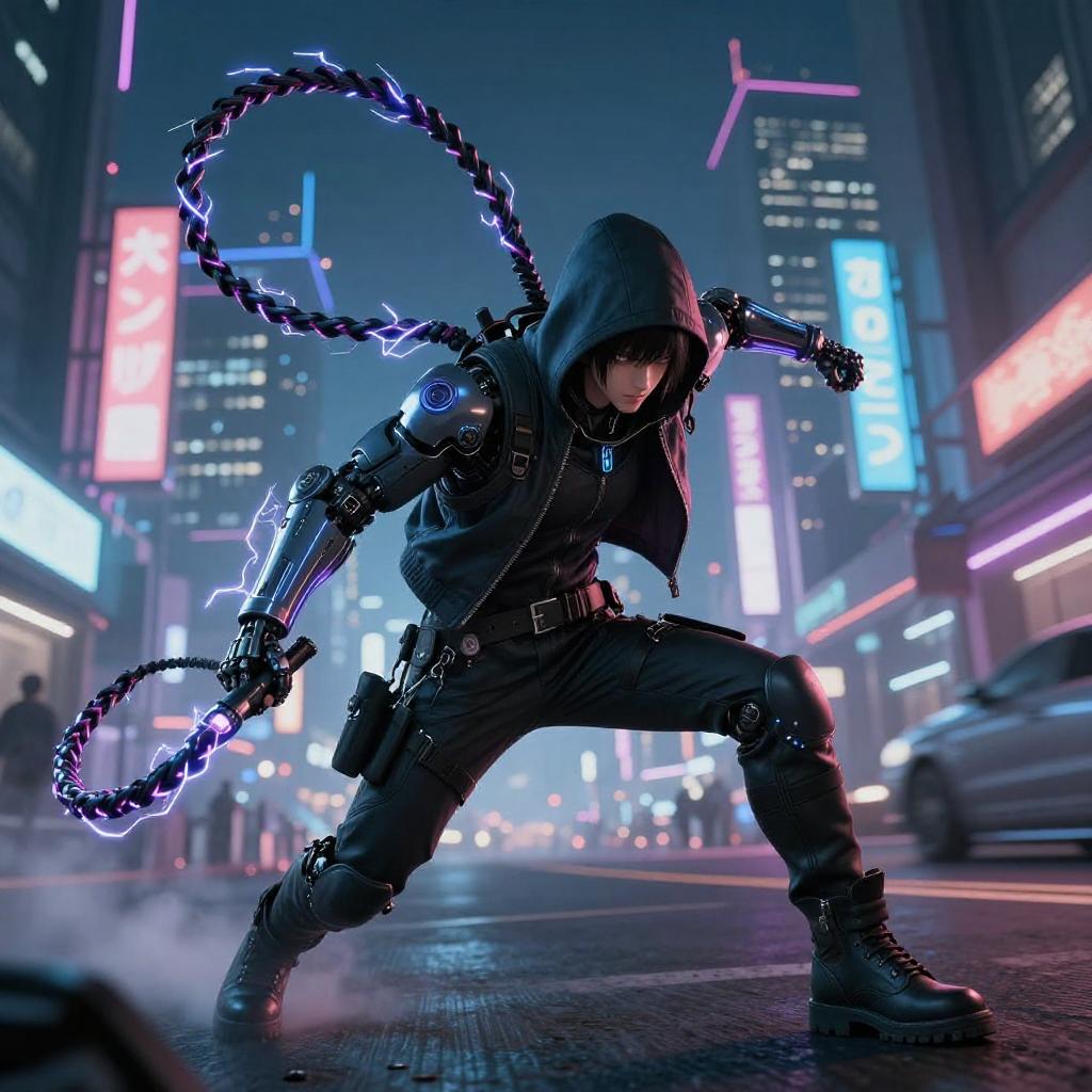 Realistic photo.a rebellious cybernetic hacker, wielding a digital whip that crackles with energy, engaging in a high-stakes chase through a neon-lit metropolis, set in a sprawling urban landscape at night, depicted in the intense and action-packed anime style of Sui Ishida. realistic photo