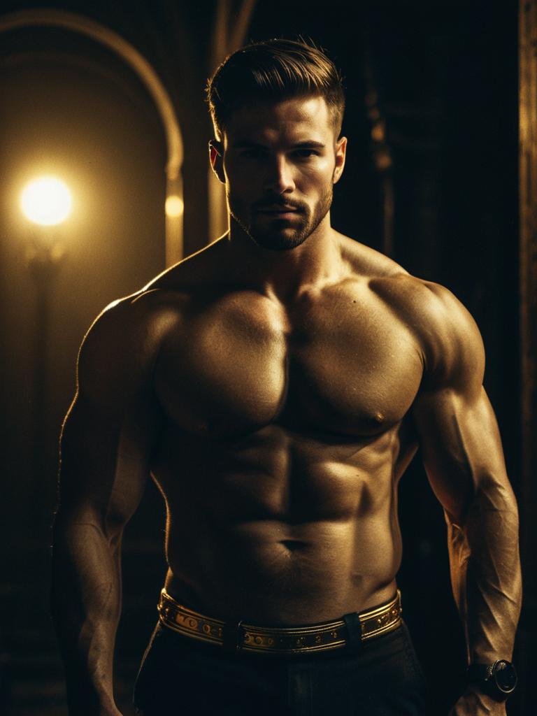 Man in Buff Male Costume, photorealistic outdoor portrait, daylight --sref 1391