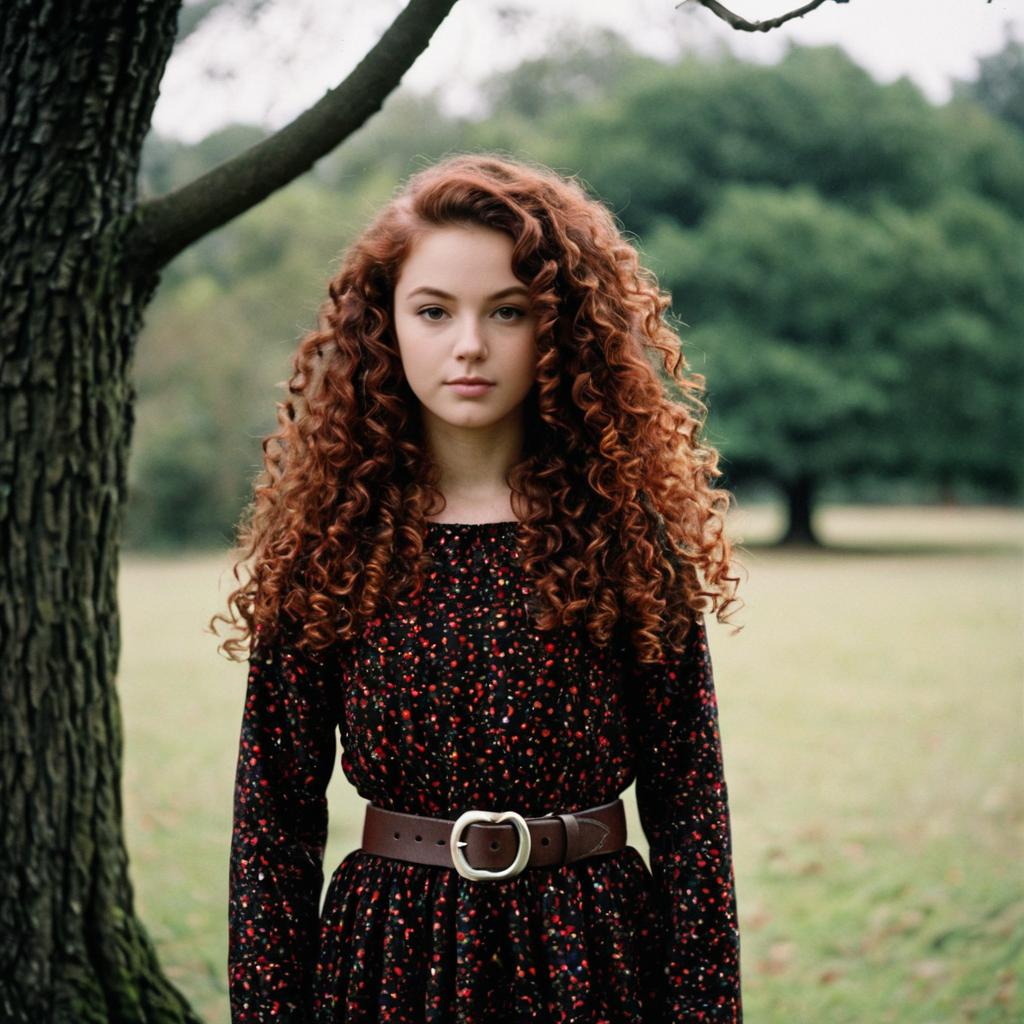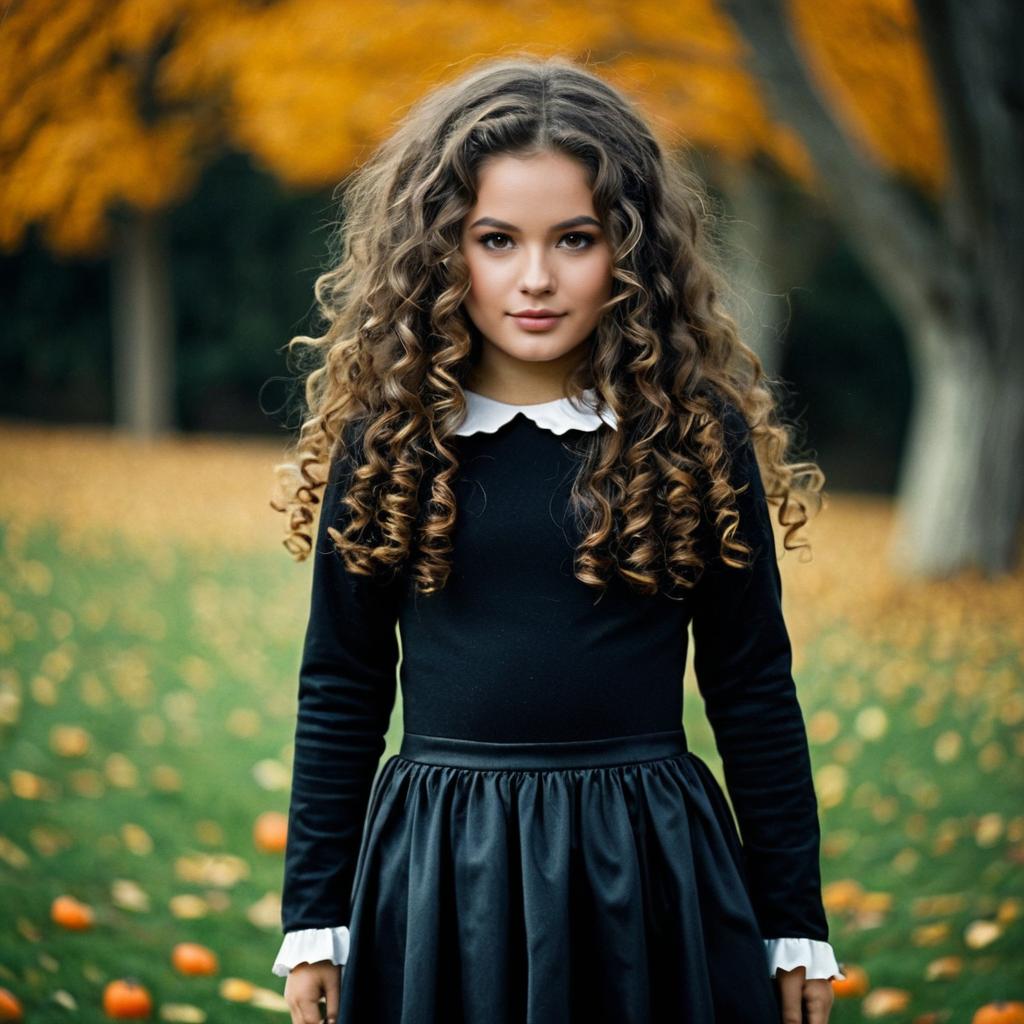 Portrait of a young girl with long, curly brown hair wearing a black dress with white collar and cuffs. She stands outdoors on a green grassy area scattered with small orange pumpkins, with autumn yellow foliage in the blurred background. The girl is looking directly at the camera with a neutral expression.
