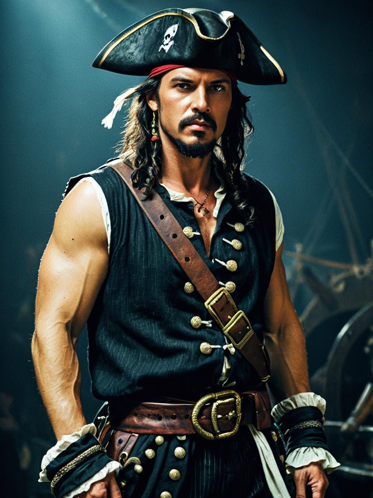 Man in Sleeveless Pirate Costume, cinematic realism, dramatic pirate editorial photo