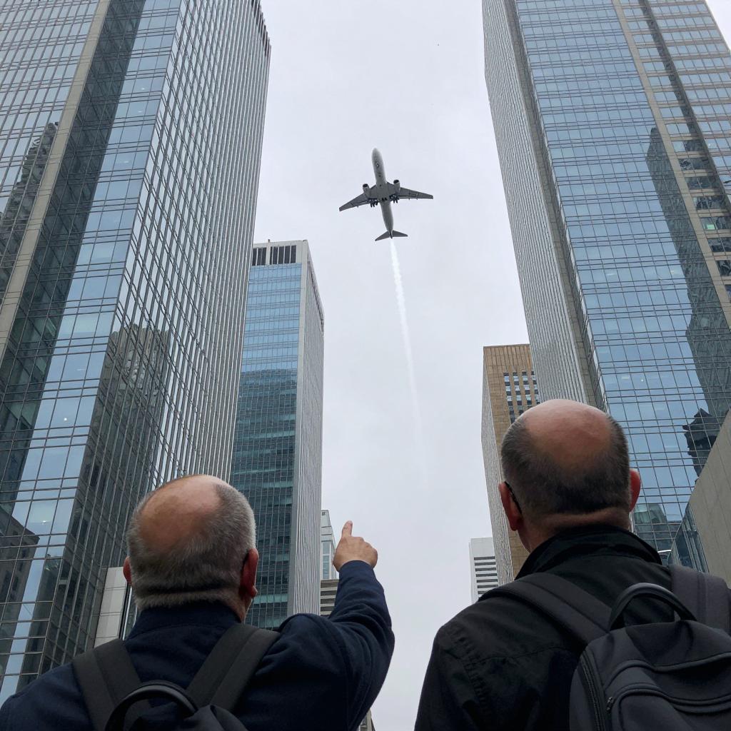 Two bald men with backpacks stand in a city center, pointing upward at an airplane flying between tall modern skyscrapers with reflective glass windows. The overcast sky contrasts with the sleek buildings, highlighting the aircraft's ascent in this urban environment.