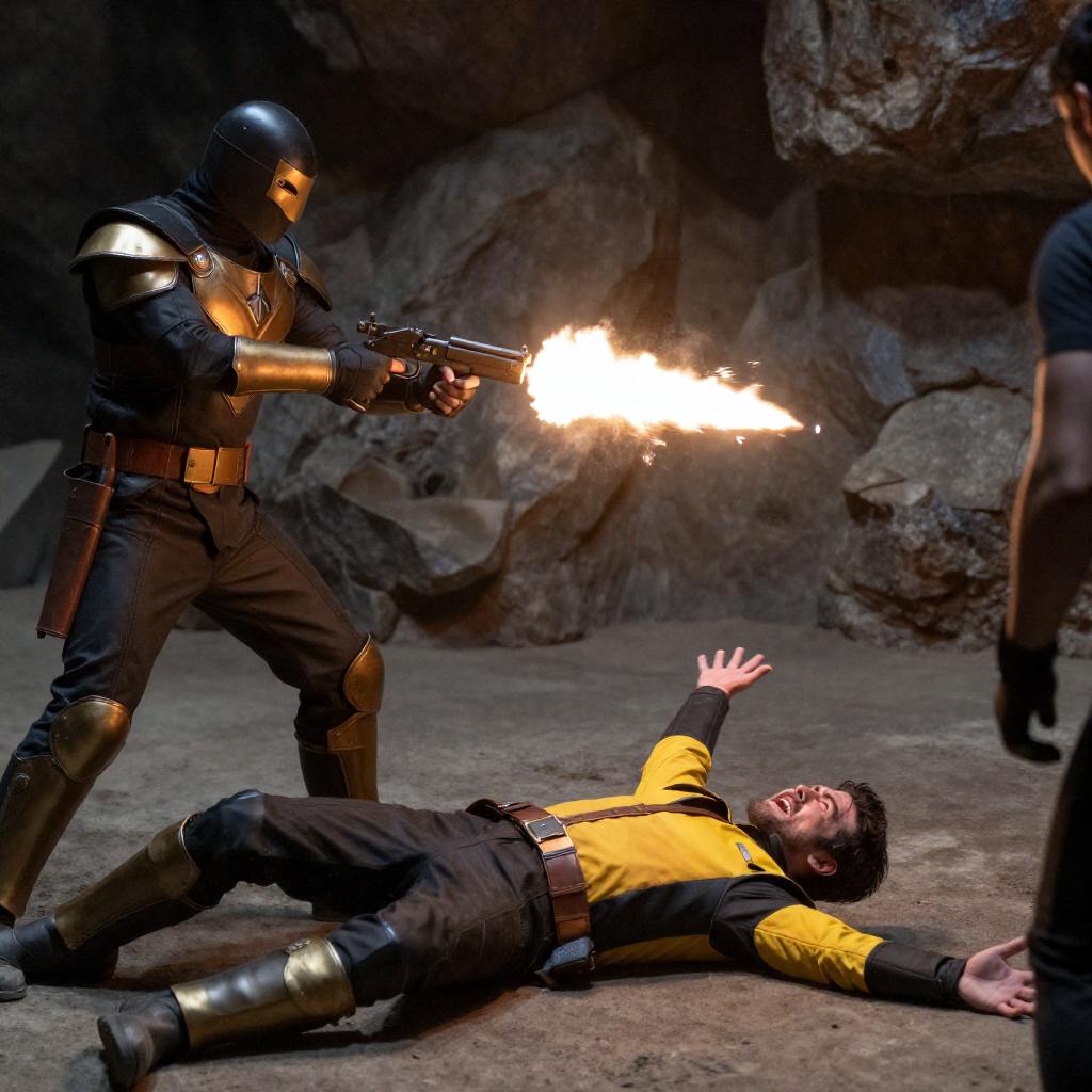 Photograph of a fight scene. A masked figure in black and gold armor fires a blaster at a man in a yellow and black outfit, who lies on the ground with arms outstretched, face showing pain. Rocky cave background. Two people. Intense facial expressions. Blaster fire creates bright light.