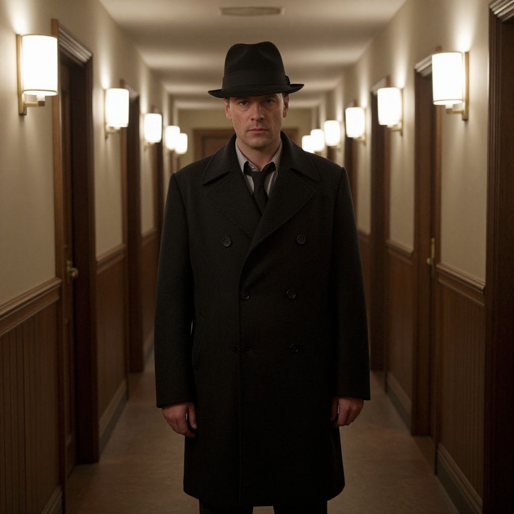 Photograph of a stern-looking man standing in a dimly lit, narrow hallway. He wears a black overcoat, black tie, white shirt, and a black fedora hat. The hallway has cream-colored walls with wooden wainscoting and is illuminated by evenly spaced wall-mounted light fixtures. The man's expression is serious, and his posture is straight and confident. The perspective of the hallway creates a sense of depth, leading the viewer's eye toward the man, who is centered in the frame. The overall atmosphere is mysterious and slightly ominous.