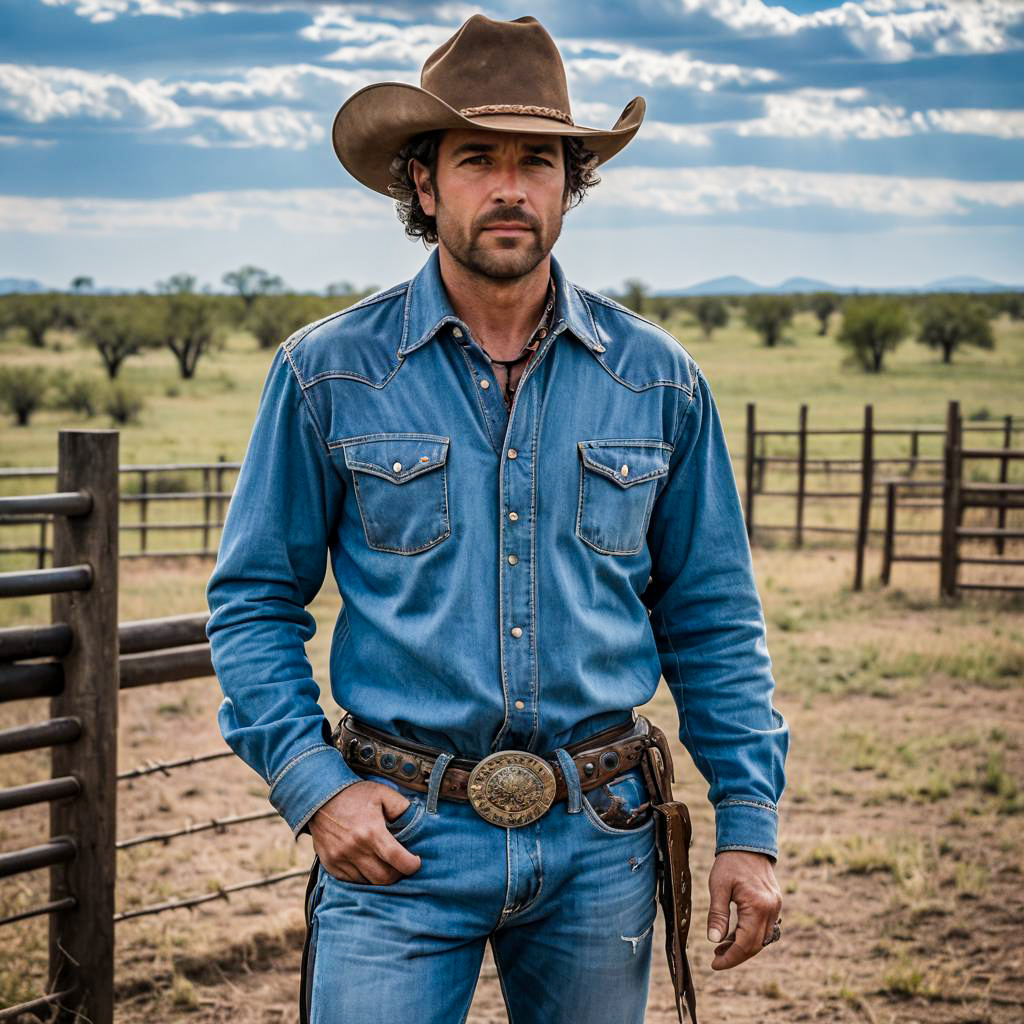 Photo of a Athletic man, Slicked-back, cowboy outfit, wearing a Burnt Orange cowboy hat, Wool denim jeans, tapered, plaid shirt, leather belt with buckle, leather boots, in a Rodeo, technicolor analog film stock