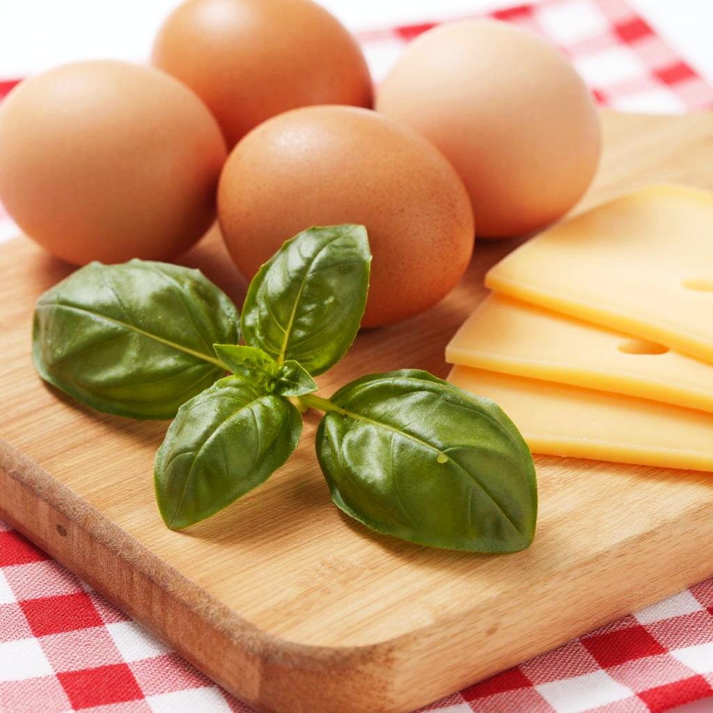 Photograph of brown eggs, fresh basil leaves, and sliced cheese on a wooden board, with a red-and-white checkered background.