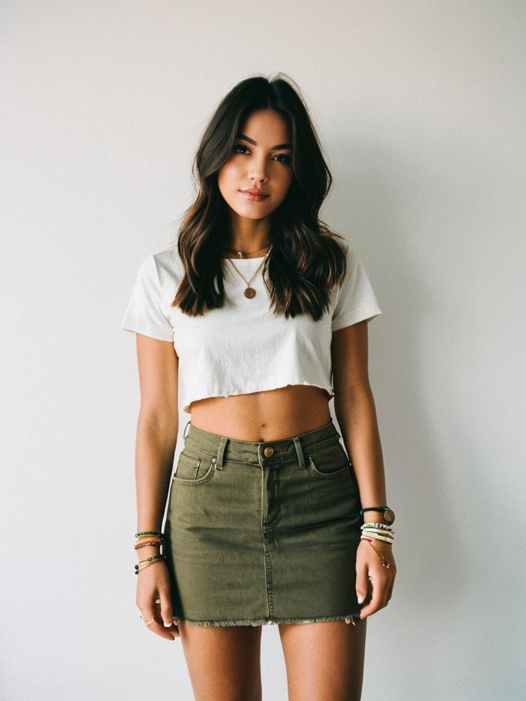 Woman, casual streetwear, cropped white t-shirt, mid-rise olive green denim mini skirt with raw hem, layered friendship bracelets, pendant necklace, white background. --sref 1388