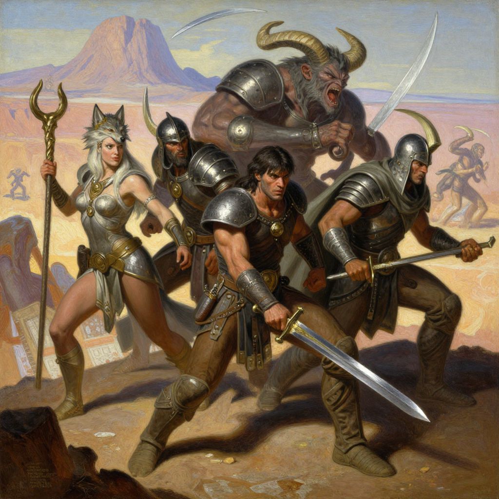 The image is a vibrant, detailed painting in the style of Larry Elmore and Frank Frazetta, showcasing a fantastical scene with a group of adventurers and monsters. The central figure is a muscular man with long, dark hair and a fierce expression, holding a sword. To his left, a woman with white hair and a wolf's head as a headdress stands holding a staff. Behind them, a bearded man in armor and a helmet with a long, curved horn is seen, while another figure in a flowing cloak and armor is partially obscured. In the background, a group of creatures, including a large, menacing figure with horns and a long, curved blade, are engaged in battle. The scene is set in a rocky, desert-like landscape with a distant mountain range, creating a sense of depth and scale. The overall composition is dynamic, with characters and creatures positioned in a way that draws the viewer's eye across the scene, from the foreground adventurers to the distant battle. The use of rich, earthy tones and intricate details in the clothing and armor adds to the epic feel of the artwork.