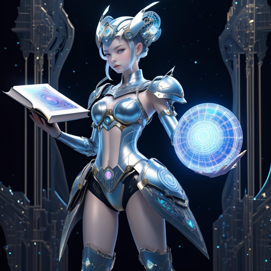 Beautiful robot-girl with metallic limbs holding a holographic book, set in a dark fantasy world. Styled in high detail by Hidetaka Tenjin.