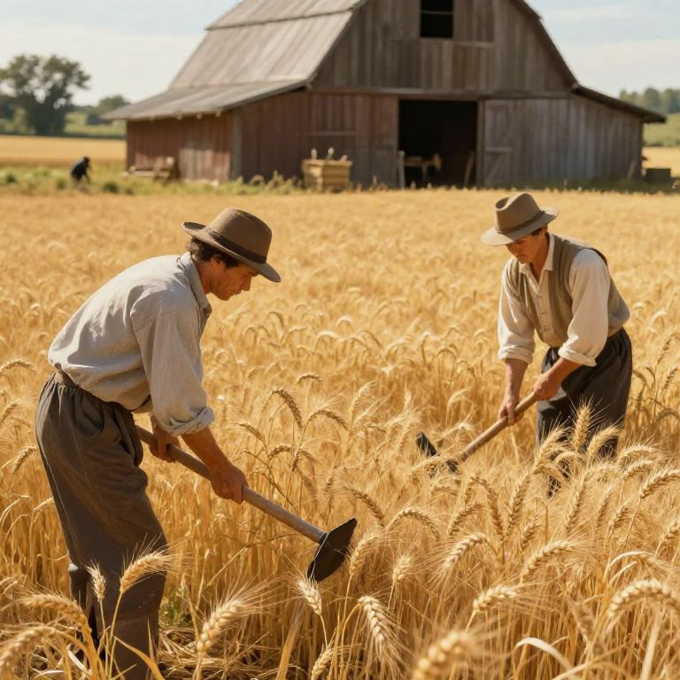 Photograph of two middle-aged men harvesting golden wheat in a sunlit field, wearing light-colored shirts, dark pants, and wide-brimmed hats. Both men are bending slightly, using pitchforks to collect the wheat. In the background, a weathered, wooden barn with a dark, open doorway stands amidst green trees. The wheat stalks dominate the foreground, their heads glistening under the sunlight. The scene evokes a pastoral, rural setting, with a bright, clear sky overhead.