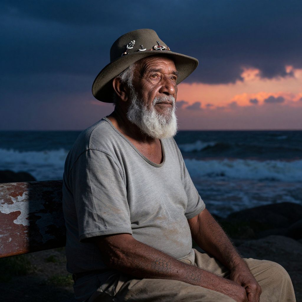 A photorealistic portrait photograph depicts an elderly Aboriginal man with a rugged visage and white beard, his lined eyes exuding wisdom. Sitting on a weathered wooden bench by a stormy sea, he wears a broad-brimmed hat adorned with nautical charms. The intense dark blue sky contrasts vividly with orange and pink hues from the setting sun, casting dramatic shadows across his vintage face and intricate tattoo sleeve—a maritime tale beneath rolled-up sleeves. As he gazes off into the distance, his expression conveys solace and introspection, inviting viewers to ponder the untold stories within.