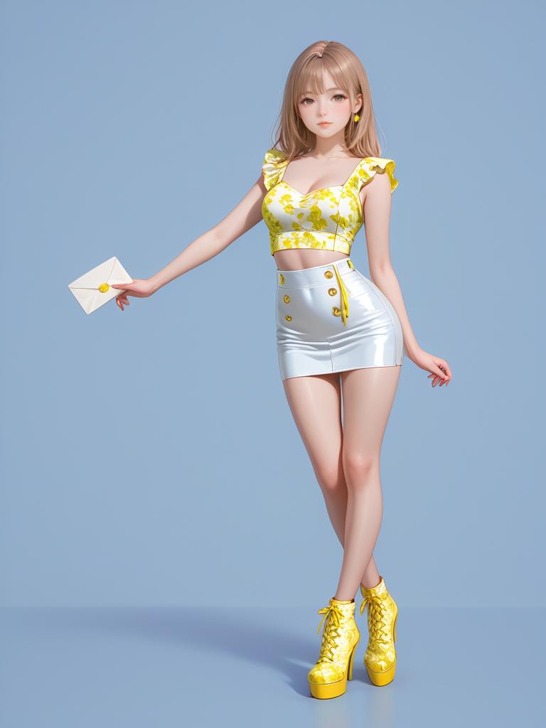 Full body shot of a young woman with realistic face and light skin tone, wearing a yellow floral print sleeveless crop top with sweetheart neckline and a high-waisted white bodycon mini skirt with gold buttons. She is holding a yellow clutch designed as an envelope, paired with bright yellow platform lace-up ankle boots. The background is a plain light blue, highlighting her trendy fashion style.