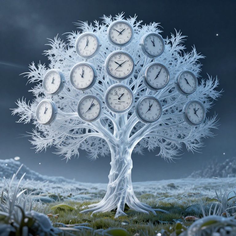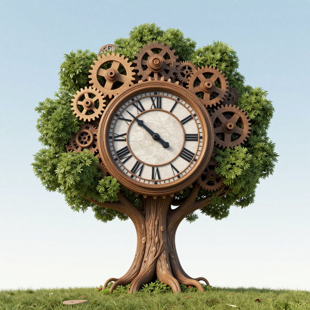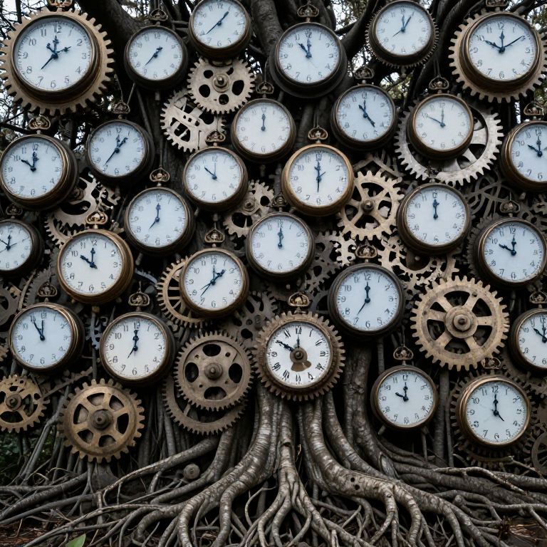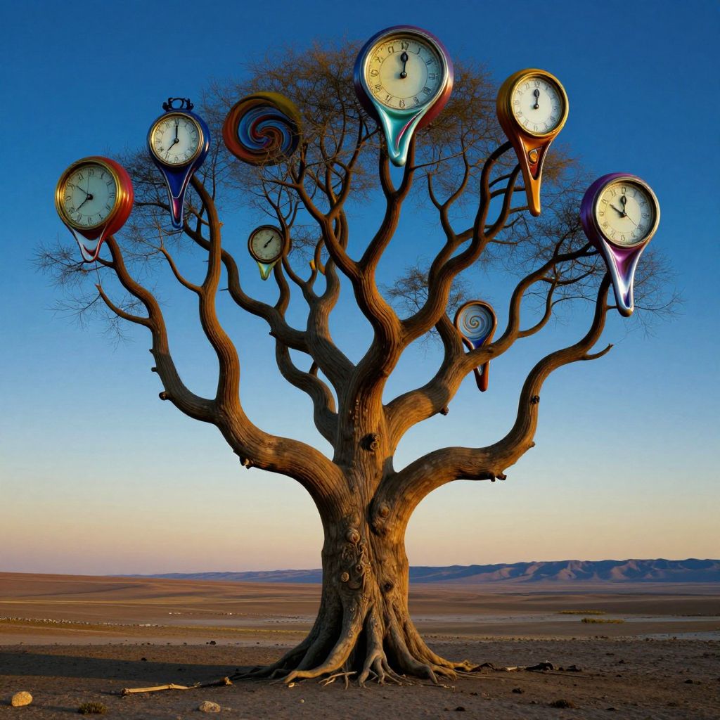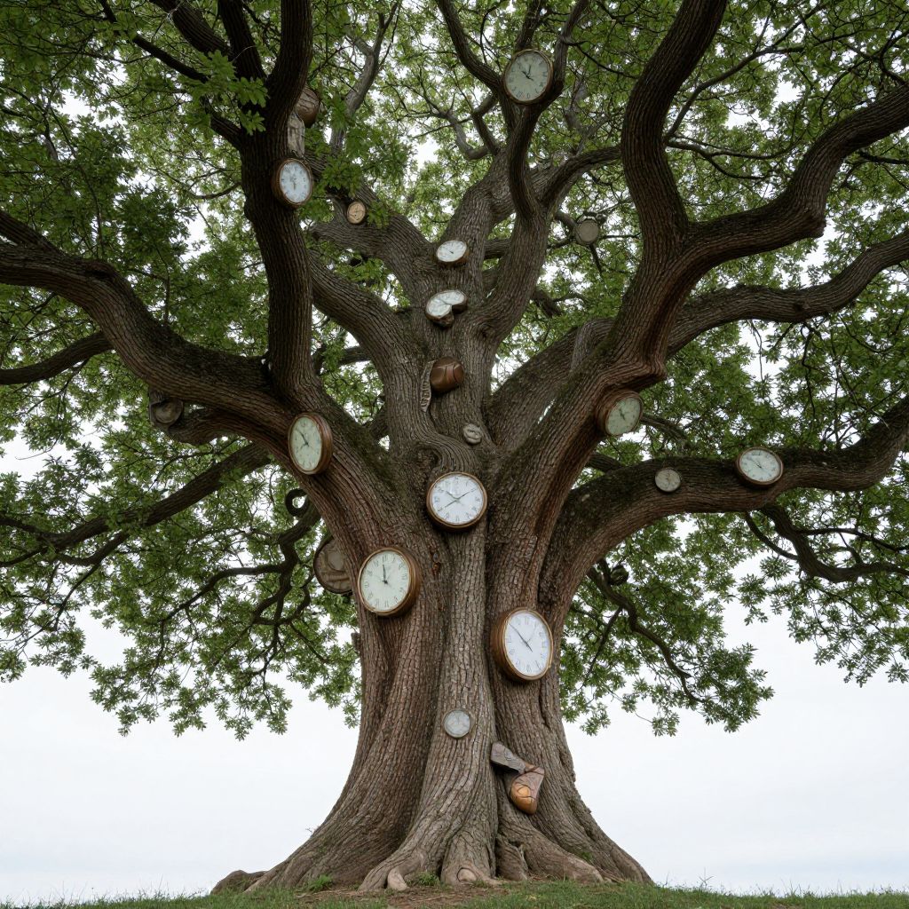 An arboreal embodiment of time's paradoxical dance, where the frozen faces of countless clocks form a canopy of serenity, while the gnarled roots below whisper the relentless grind of gears—a haunting symphony of transience and eternity.
