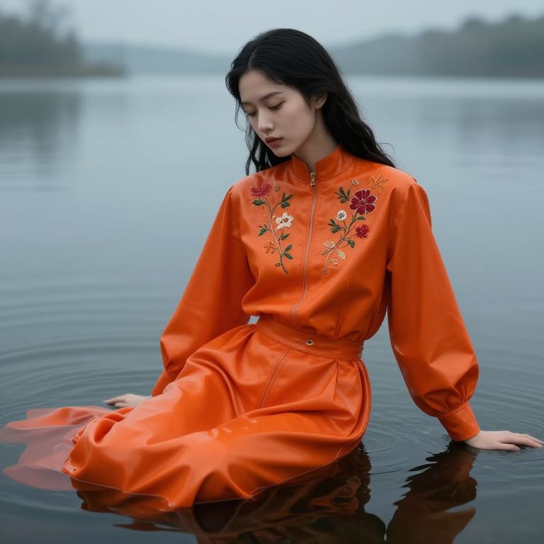 "Embroidery Embellishment a beautiful girl in long orange latex wear sits in the water, in the style of poignant portraits, leather/hide, cottagecore, soft-edged, iconic, dark, sleek,"