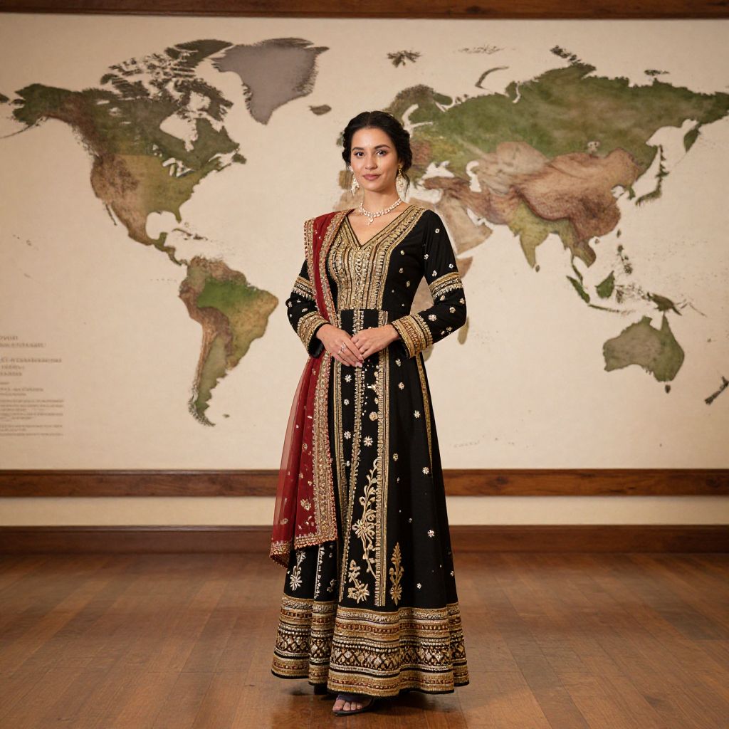 Photograph of a South Asian woman standing in front of a world map backdrop in a museum-like setting. She wears a black traditional long kurta with intricate gold embroidery, white polka dots, and a red maroon dupatta draped over her right shoulder. Her dark hair is styled in a simple updo. She has light brown skin, a slender build, and is wearing subtle gold jewelry, including a necklace and earrings. The wooden floor contrasts with the beige wall and map. The woman stands with hands gently clasped in front of her, smiling softly at the camera.