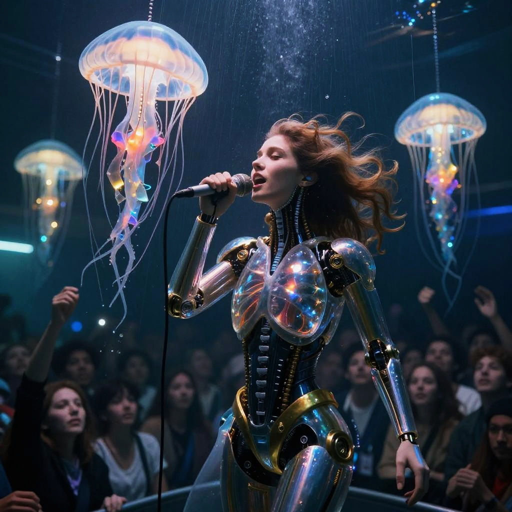 Cybernetic opera singer with glass lungs and brass vocal augmentations in submerged subway concert hall, as bioluminescent chandeliers unraveling like jellyfish, sending tendrils of light like rain over the audience pours radiant lights like rain on the crowd, creating a hauntingly luminous and triumphant atmosphere. Captured in underwater hyperrealist concert photography, this scene showcases a moving performance bridging human emotion and machine respiration with ultra-detailed portraits, Seed 424242 ar.