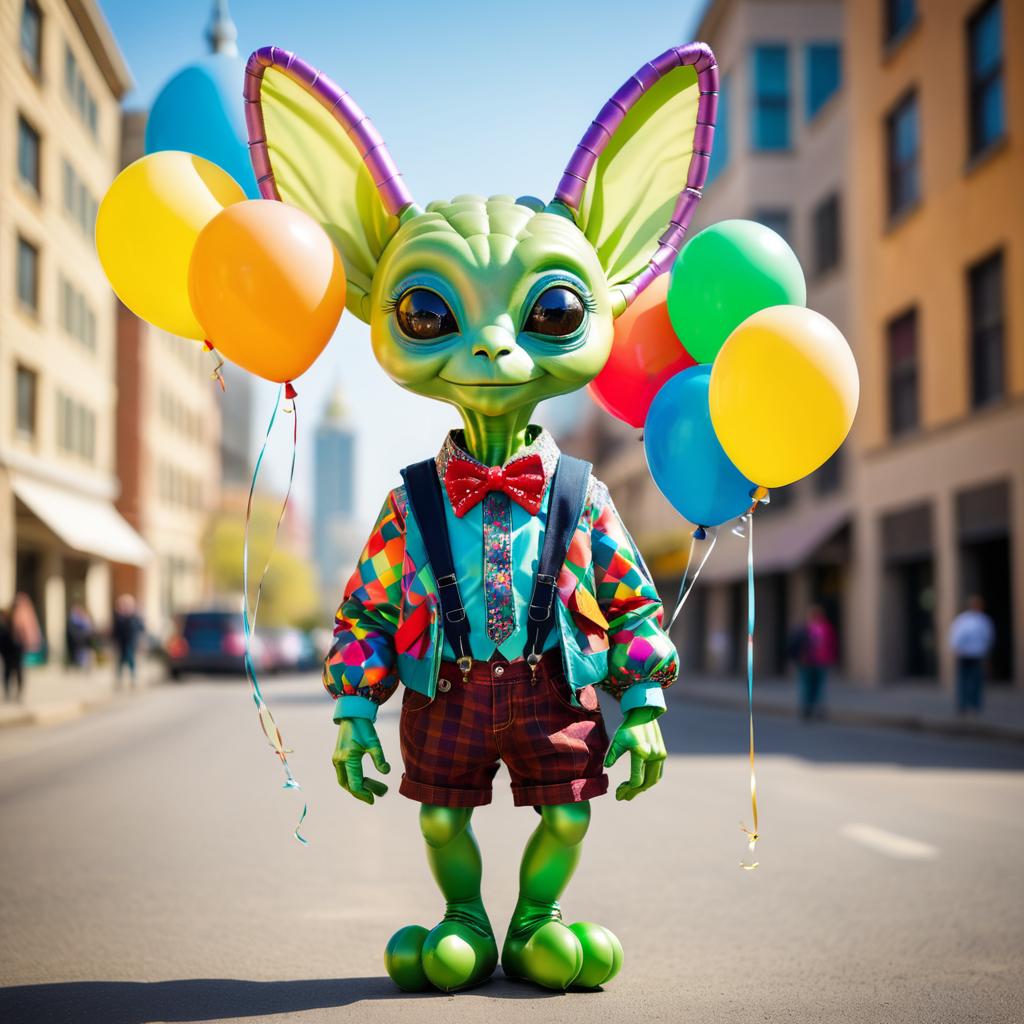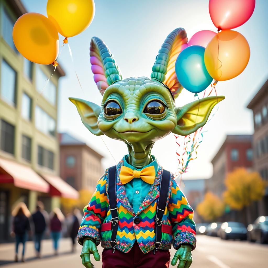 A realistic portrait of a small green alien creature with large ears and colorful striped horns, wearing a detailed patterned jacket, suspenders, and a yellow bow tie, holding vibrant balloons. The background shows a softly focused urban street scene with buildings and warm sunlight creating a bright and lively mood.