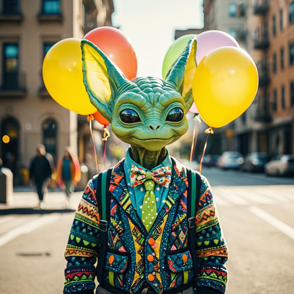 A realistic portrait of a small green alien creature with large ears holding colorful balloons, wearing a detailed patterned jacket and suspenders, urban background with soft focused buildings, warm sunlight illuminating the scene, mood bright and lively
