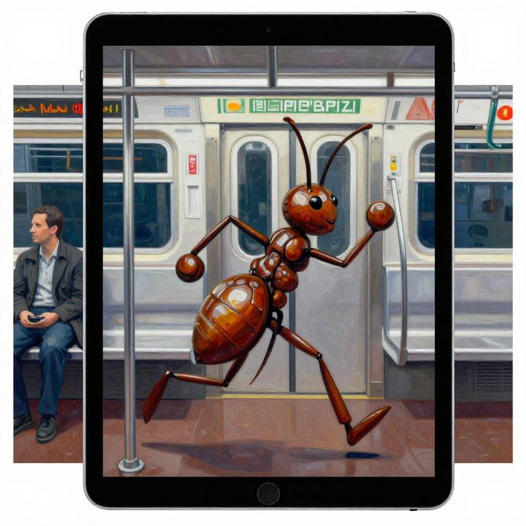 A painting of a ipad pro with arms and legs that is running out of the nyc subway on a monday morning, subway ants painted in the style of chuck close