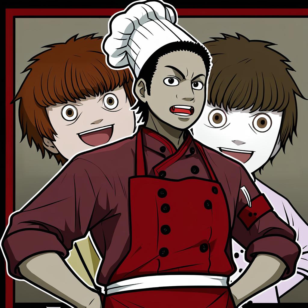 Hanamura teruteru, danganronpa (series), 1boy, upper teeth only, brown hair, short hair, medium hair, red apron, chef hat, long sleeves, chef, chef, red neckerchief, by artist kasumi (skchkko), anime