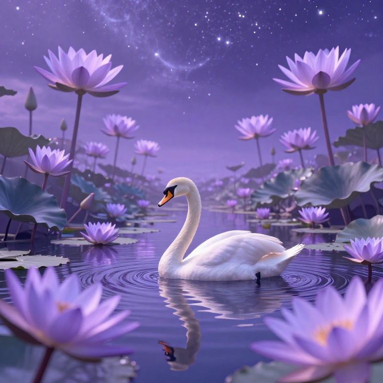 Digital artwork depicting a serene, moonlit pond at night. A white swan with a black beak and eye mask sits gracefully in the center, reflecting in the calm water. Surrounding the swan are numerous glowing purple lotus flowers with open petals and dark green leaves, floating on the water's surface. The background features a starry, cosmic sky with a visible galaxy. The scene is illuminated with a soft, ethereal light, creating a magical and tranquil atmosphere. The swan's ripples in the water add a sense of movement.