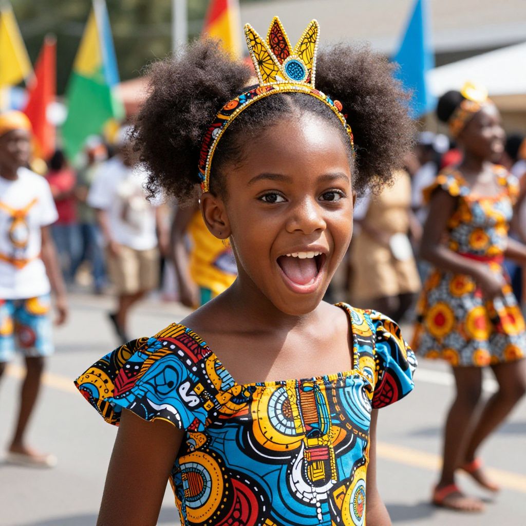 Photograph of a joyful young African girl with dark skin, wearing a colorful, patterned dress and golden crown, smiling brightly in a lively outdoor parade