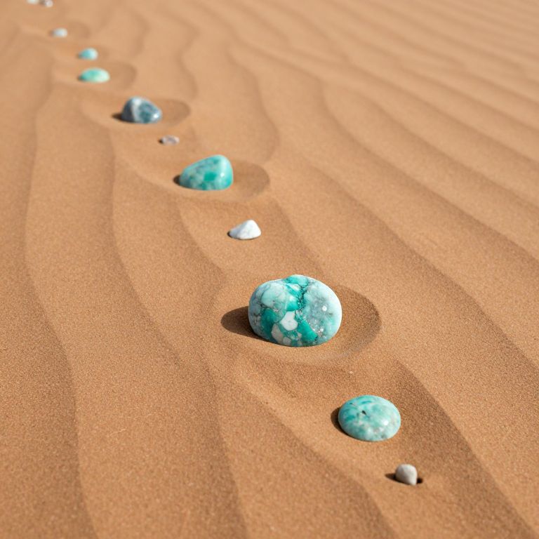 Amidst the silent expanse of shifting sands, a scattering of ethereal aquamarine stones whispers ancient tales of forgotten worlds, their cool, crystalline presence offering a fleeting glimpse of hope and mystery in the heart of desolation.