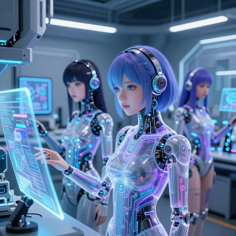 Anime AI girls as part of an advanced robotics laboratory setting, high-tech machinery in background with sleek holographic displays, girls showcasing advanced AI with semi-transparent circuits visible under soft skin, cool blue and purple hues enhancing sci-fi ambiance, detailed and vibrant.