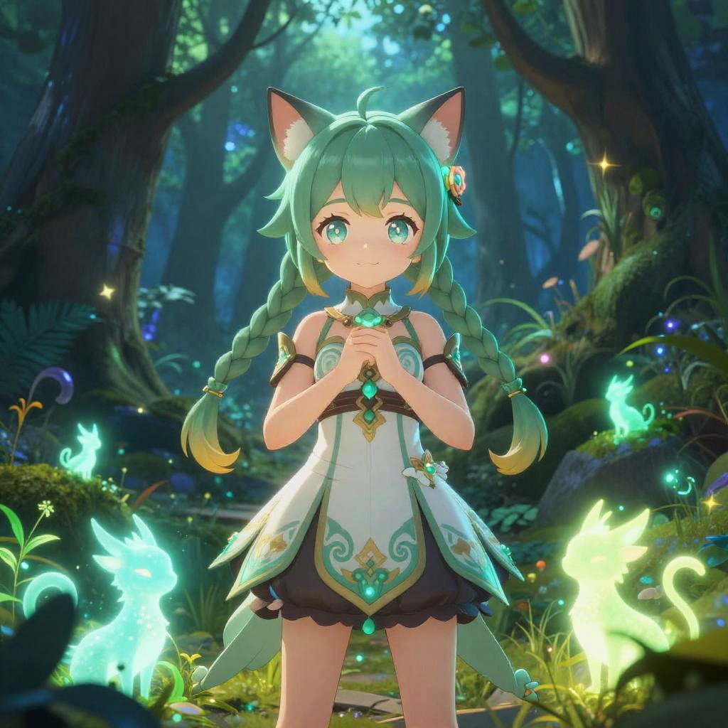 An anime-style girl with green cat ears and braided hair stands in an enchanted forest. She is wearing a detailed fantasy outfit with intricate patterns in white and green colors. Around her are glowing magical creatures resembling small foxes and ethereal plants, illuminated by soft mystical lighting in shades of green and blue. The forest background is highly detailed, adding to the enchanting atmosphere.