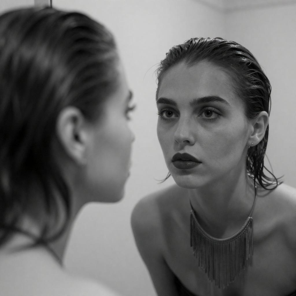Black-and-white photograph of a young woman with slicked-back, wet hair, wearing dark lipstick and a fringed necklace. She gazes intently at her reflection in a mirror, with blurred light and shadow creating a dramatic effect. Her expression is serious and focused. The background is out of focus, emphasizing her face and reflection.