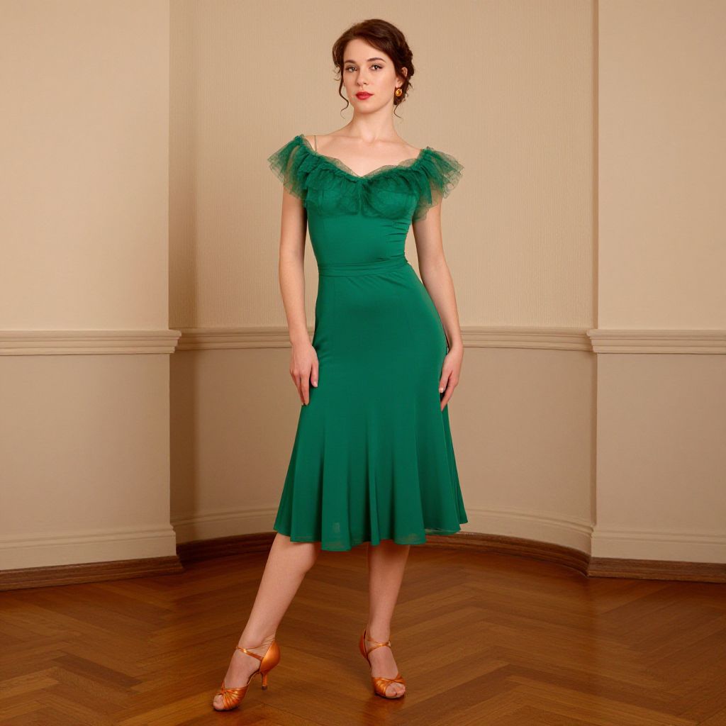 Vintage Dance Costume, woman in a green dress standing in a room