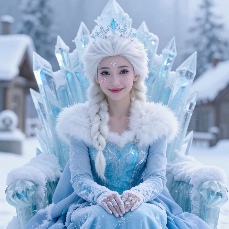 A delicate snow princess with soft white fur and glowing icy sparkles along her cheeks and hands, sitting on a snowy throne made of ice crystals in a mystical winter village, her face having a gentle, fairy-like expression with pale pink lips and a serene smile, detailed lighting showing the sparkling effect of cold frost on her fur and skin