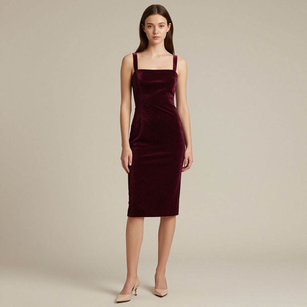 Young woman with fair skin and straight long brown hair wearing a deep burgundy velvet shift dress with thin straps and straight neckline. The knee-length fitted dress is paired with beige kitten heel shoes. The neutral beige background highlights the chic and elegant style of the outfit.