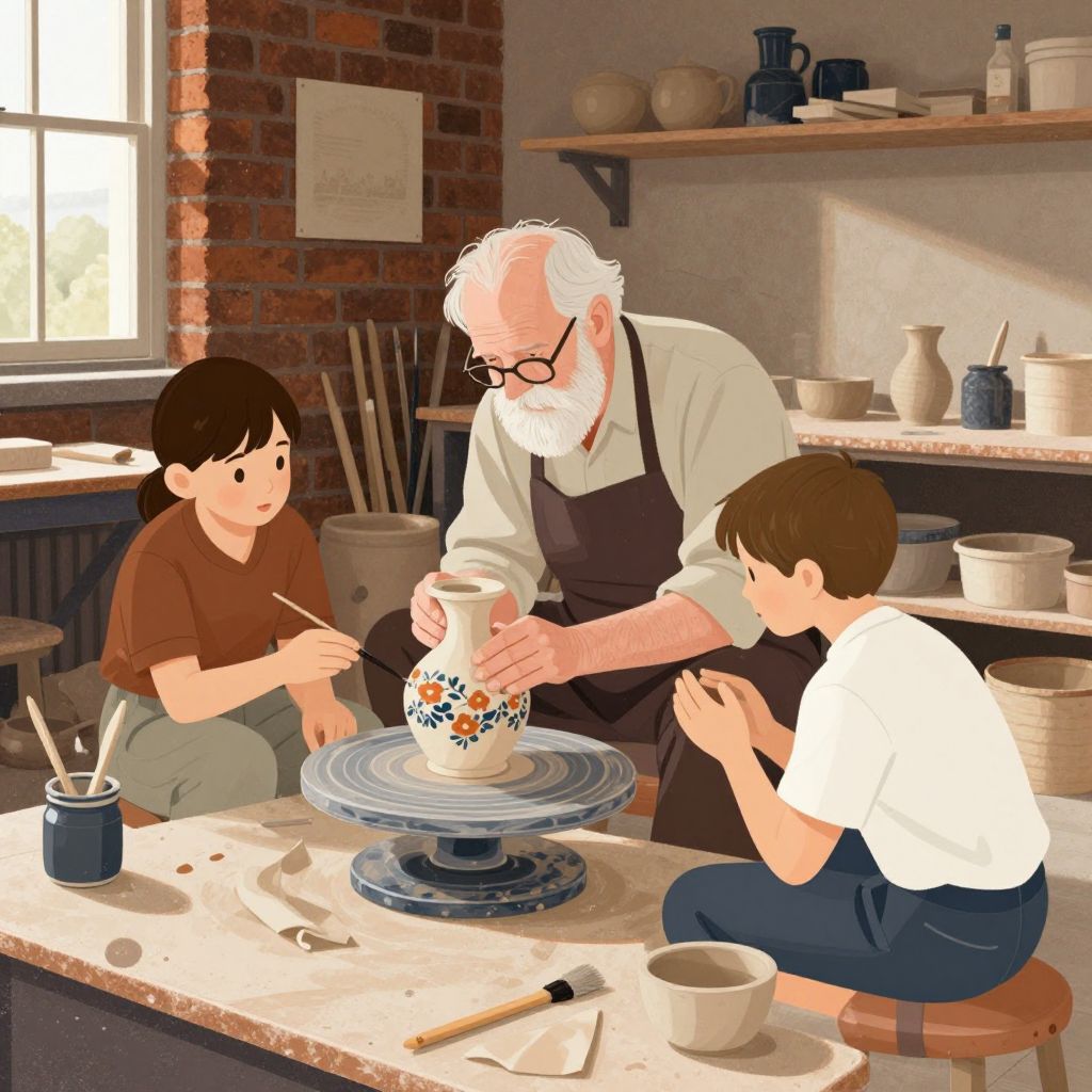 Digital illustration of an elderly white man with a white beard teaching pottery to two young children in a sunlit, brick-walled studio.