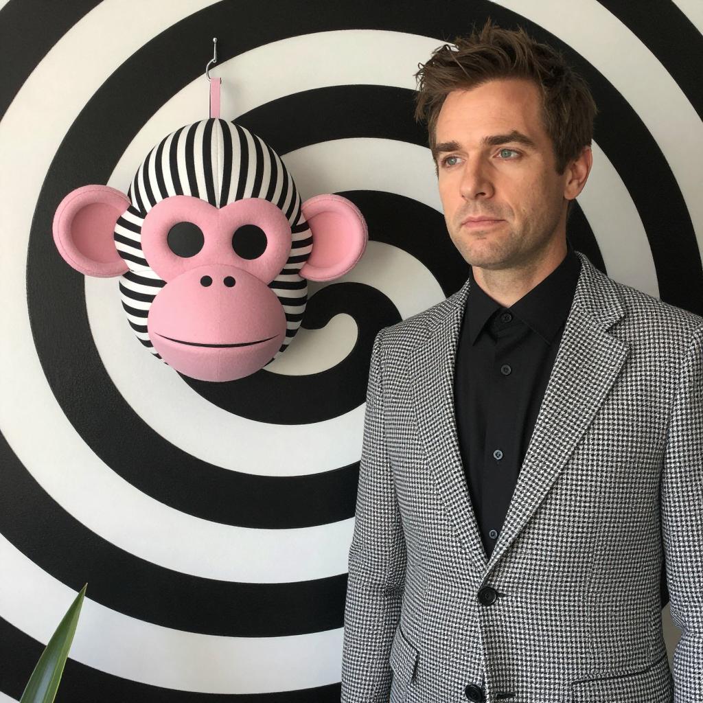 Photograph of a man with brown hair in a black-and-white checkered suit, standing to the right. Background has black-and-white spiral patterns. On the left, a pink monkey-shaped hat with black-and-white stripes hangs from a hook. The man looks slightly to the side with a neutral expression. Indoor setting with a plant in the lower left corner.