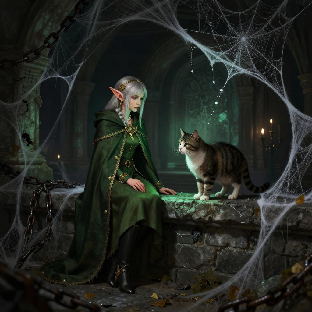 Alone in dungeon with elf & cat girl, eerie dungeon filled with spider webs and broken chains, elf with elegant green cloak blending into shadows, cat girl balancing nimbly on stone ledges, suspenseful and enchanting vibe, richly textured fantasy environment with subtle magical glow