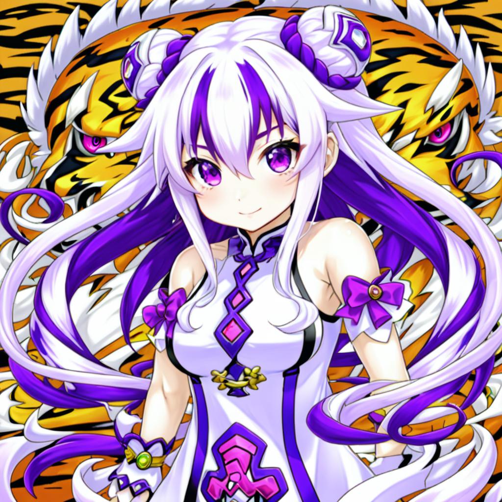 Haku (p&d), puzzle & dragons, 1girl, tiger tail, white hair, two-tone hair, long hair, purple hair, double bun, twin braids, medium breasts, bare shoulders, by artist sasaki tomomi, anime