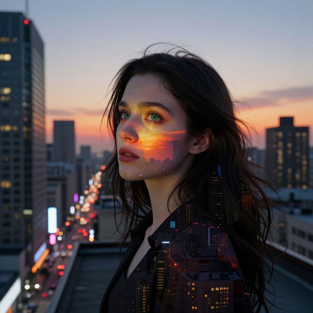 A photorealistic portrait of a young woman with porcelain skin and flowing raven hair stands atop a bustling city rooftop at dusk. Her intense green eyes pierce through the chaos of skyscrapers and neon lights, gazing towards a fiery sunset that blends her figure with the urban landscape. This image captures an emotional double exposure, reflecting vibrant colors onto her tear-filled eyes, conveying both strength and vulnerability. A sense of longing emanates from this scene, as if something just beyond reach is calling to her.
