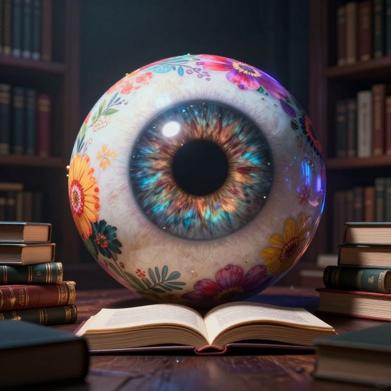 Photograph of a vividly colored, floral-patterned, giant eyeball sculpture on a wooden table, with an open book, surrounded by stacked books