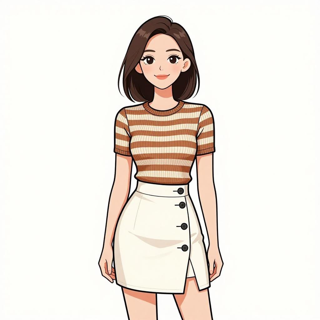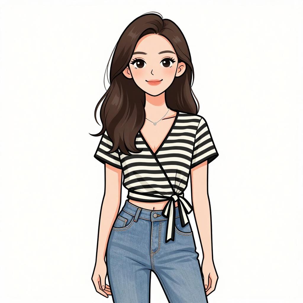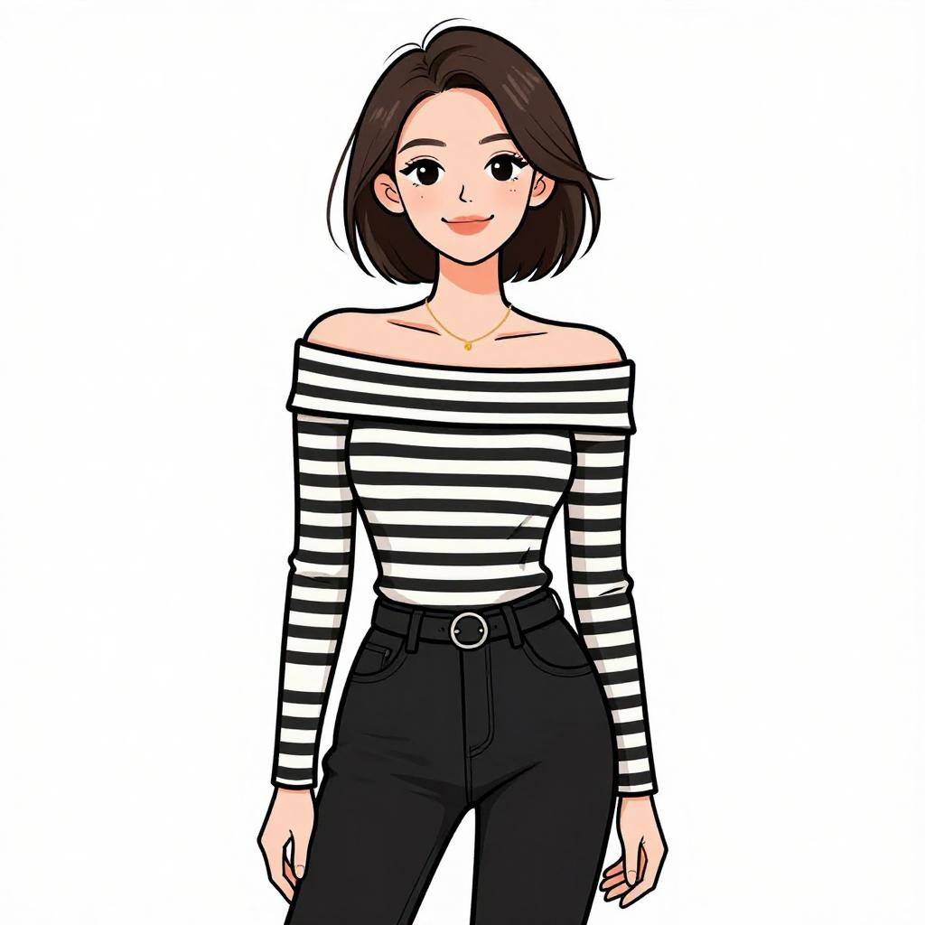 Woman with pretty face and pretty hair. smiling Woman, casual chic, off-the-shoulder long-sleeve top in black and white horizontal stripes, fitted silhouette, high-waisted black jeans, skinny belt with a round buckle, dainty gold necklace, white background --sref 1467