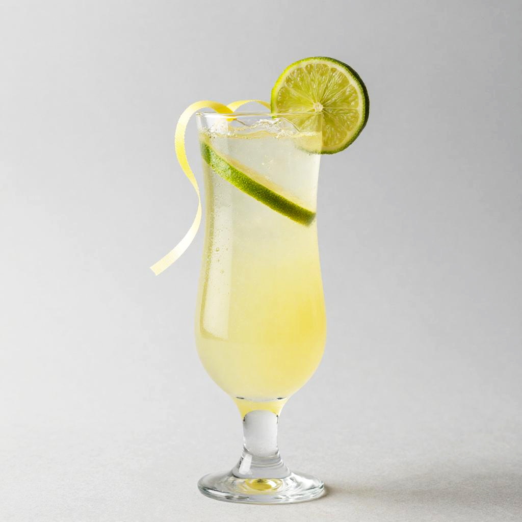 A cucumber lime spritzer in a tall collins glass, garnished with thin cucumber ribbon and lime wheel. This artistic representation features bright colors and a minimalistic design, creating an inviting atmosphere for a refreshing summer drink.