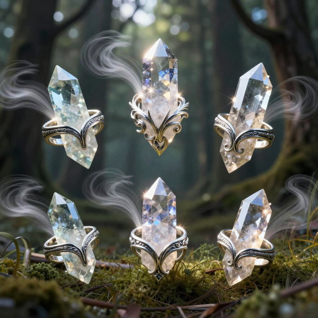 Magical artifacts for Gale, enchanted amulets and rings emitting breezy light trails, crafted from rare crystals and silver, wind motifs engraved, set against a backdrop of a serene forest with gusts of wind bending the trees, magical realism style, high detail