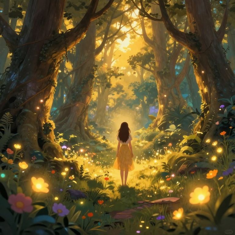 Digital art depicting a magical forest scene at sunset. A lone girl with long brown hair, wearing a yellow dress, stands at the center, facing a radiant, golden light that filters through towering trees. The forest floor is lush with vibrant flowers and glowing fireflies. Tall, twisted trees frame the scene, with their bark textured and covered in moss. Sunlight creates a warm, ethereal glow, illuminating the path ahead. The background is a blur of greenery and light, enhancing the enchanted, dreamlike atmosphere. The style is whimsical and highly detailed, evoking a sense of wonder and magic.