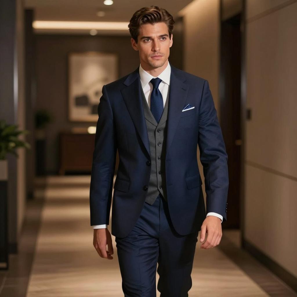 Umbrella suit party wear, photo of handsome man, standing, holding transparent umbrella, formal dark blue suit, beige vest, striped tie, medium brown hair, slight beard, smiling, elegant interior, chandelier in background, warm lighting, green plant on the right, modern classic style, daytime, realistic, detailed, stylish
