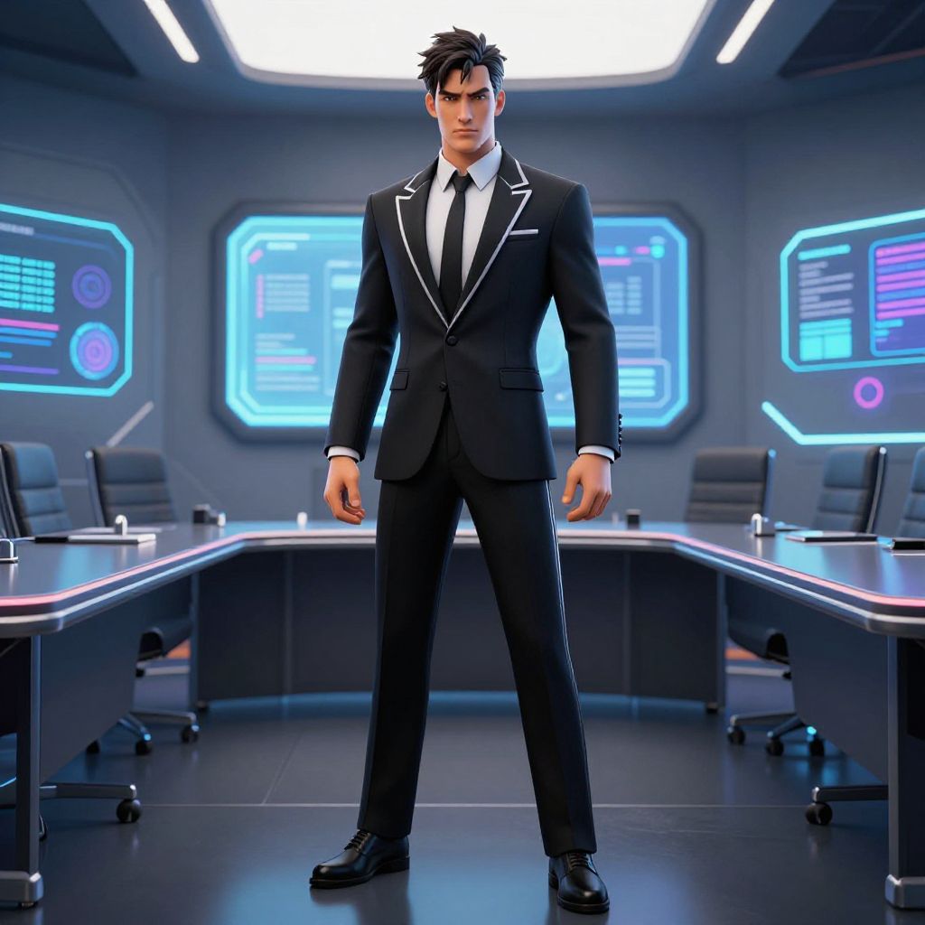 This digital CGI image features a tall, handsome man with dark hair and a serious expression, standing in the center of a futuristic, high-tech room. He wears a sharp black suit with white trim, a white shirt, and a black tie. His black leather shoes are polished. The background includes sleek, dark gray walls with glowing blue and purple holographic screens displaying data. The room has a large, L-shaped desk with black chairs on either side. The lighting is bright, highlighting the man's figure and the modern, high-tech environment. The overall style is sleek and futuristic.