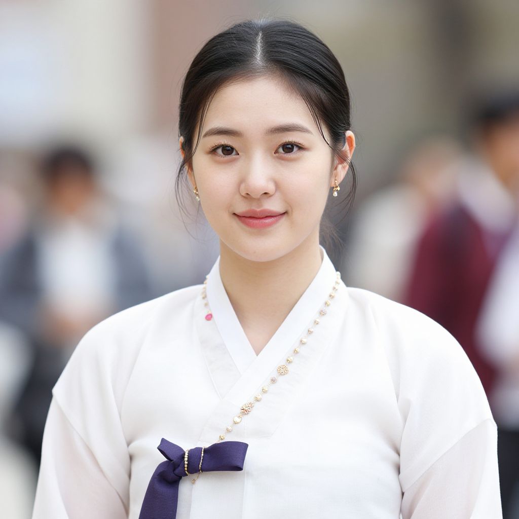 Photograph of an Asian woman with long black hair in a braid, wearing a white and red traditional Korean hanbok with a red bow,