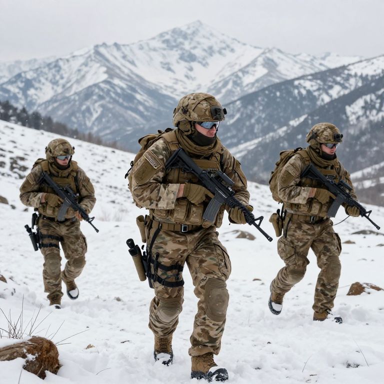 Army photo prompt: A modern army unit conducting field operations in a mountainous region, snow-covered peaks, wind-blown uniforms, detailed tactical gear, realistic and grounded atmosphere, immersive photo style, dynamic movement, high resolution.