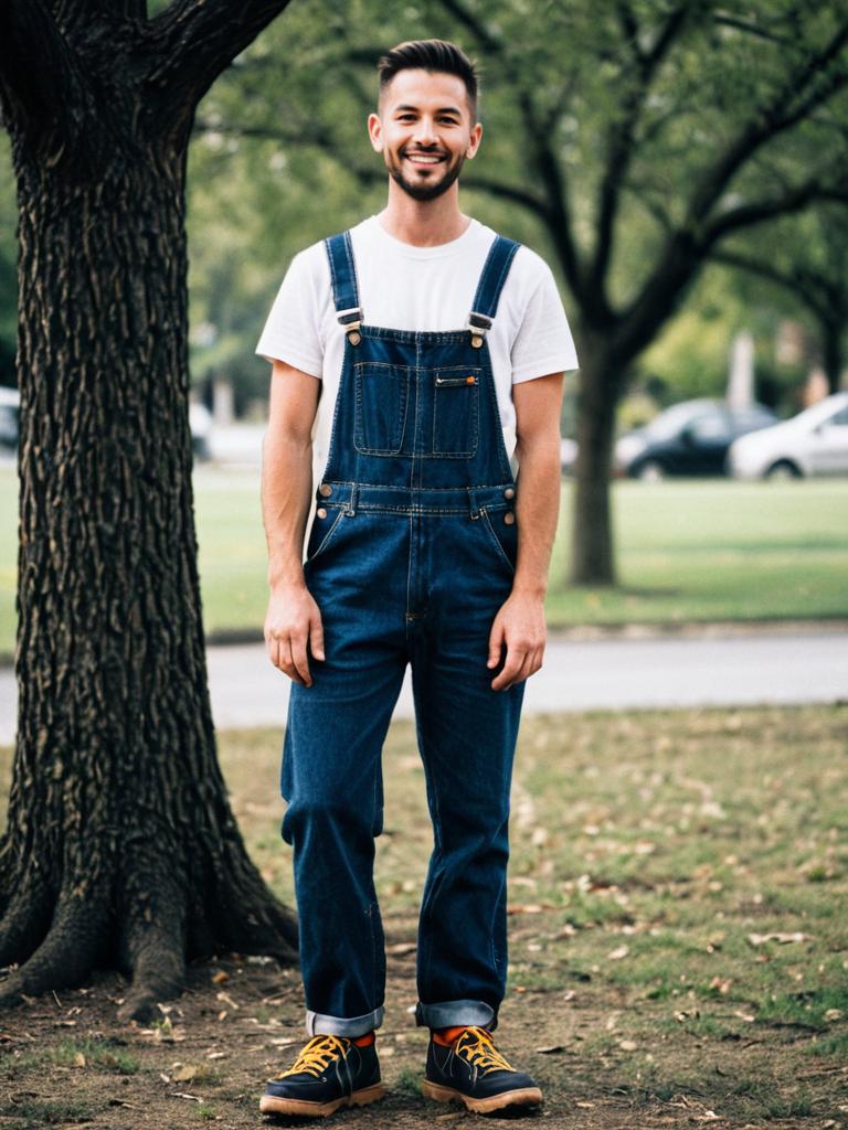 Funny appropriate costume, 1boy, male focus, solo, outdoors, tree, full body, shoes, overalls, standing, short hair, smile, blurry background, suspenders, shirt, facial hair, blurry