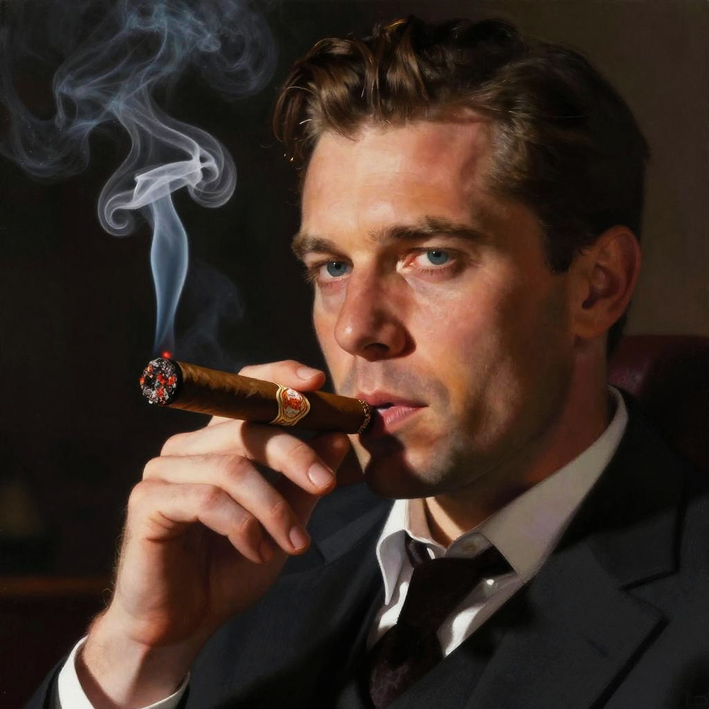 Why does Andrew Tate smoke cigars? Stylized portrait of Andrew Tate with a cigar, glowing embers, strong dramatic shadows, cinematic close-up, 8K resolution, photorealistic digital painting
