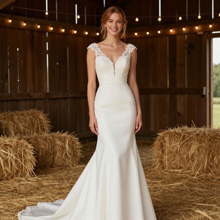 Photograph of a smiling Caucasian woman with light brown hair in an updo, wearing a white, sleeveless, lace-trimmed, V-neck, mermaid-style wedding dress. She stands in a rustic barn with wooden walls, illuminated by warm string lights. Hay bales are scattered on the straw-covered floor. The barn's dark wood and hay create a cozy, rural atmosphere. The dress's lace detailing adds a delicate, elegant touch, contrasting with the barn's rustic elements. The woman's fair skin and natural makeup complement the simple, yet romantic setting.